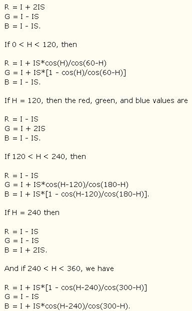 在這個過程中,運算了非常複雜的運算式,首先要計算x,y,r1的數值,在對三種變數作if的程式判定,才能給定H,S,I的每一個值,這個部份真的是看了非常非常之久,透過跟同學的討論才有一點點的理解,整個RGB的轉換及if判斷式子都是從以下得知: